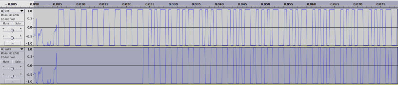 Analyzing the generated sound file with Audacity, It is notorious the silence issue at the beginning of the mag-stripe wave(<0.005):