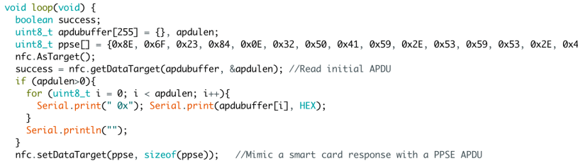 With AsTarget(), we initialized the PN532 as target(emulation mode) to behave as smart card. With the getDataTarget(), we will be able to obtain the communication from the PoS or terminal in a short period of time. The setDataTarget() is to communicate commands to the PoS or terminal depending of the data of getDataTarget().