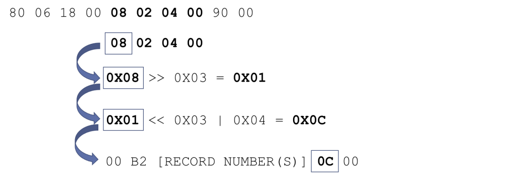First, we must shift 3 positions to the right because the real SFI is the first 5 bits in the 0x08 byte. So 0x08 = 0000 1000, after we shifted the three positions >> 3 = 0000 0001 = 0x01. We have to shift the result 3 bits to the left; and finally, we use 4 to get the real SFI. The last 3 bits have to be set to “00000100” thats why we combined the 4 = 00000100: