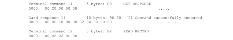 For this analysis, I will use partial communication between a card and terminal from a transaction. To analyze the SFIs, we will focus on the Card response 11: 80 06 18 00 08 02 04 00 90 00