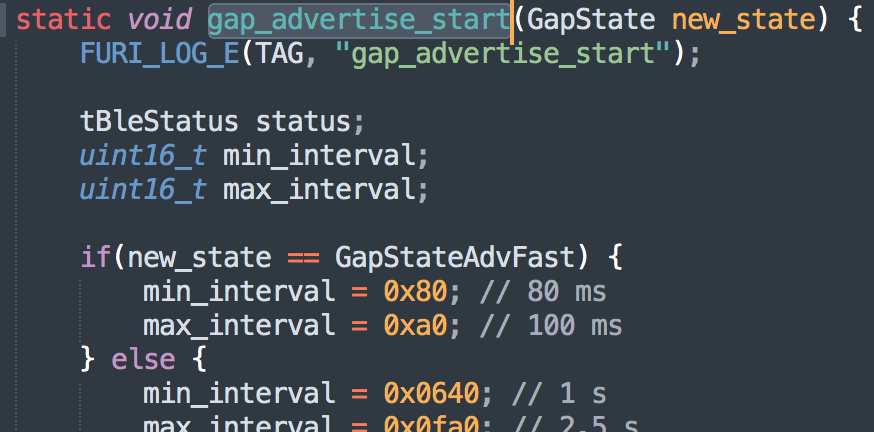 First, we should be able to edit our Flipper Zero firmware and modify a file. Specifically, the gap.c that it is located in ble_glue folder. We must focus on the function gap_advertise_start. This function is called when we activate the Bluetooth service in our Flipper config navigation menu.